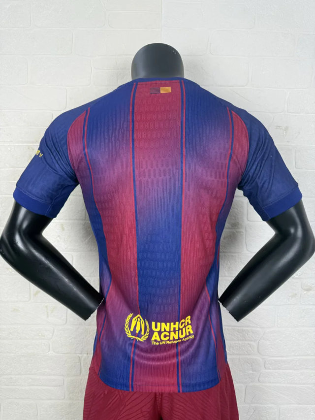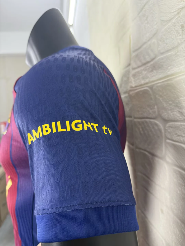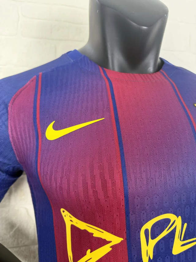 ✅ Versión jugador (Player Issue) con tejido Nike Dri-FIT ADV, escudo y logo termo-aplicados en silicona, corte slim fit y bandera catalana en el cuello.